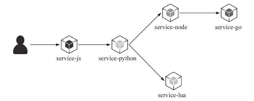 service-js服务是一个由Vue/React实现的前端应用,当用户访问前端Web页面时,用户会看到一个静态页面。当用户点击相应的按钮时,前端页面会通过浏览器异步请求后端service-python服务提供的API接口,service-python调用后端service-lua服务和service-node服务,而service-node服务又会调用service-go服务,最终,所有服务配合来完成用户的请求,并把结果合并处理之后发送给前端浏览器。当前端页面收到请求的响应数据时会渲染出新的页面呈现给用户。