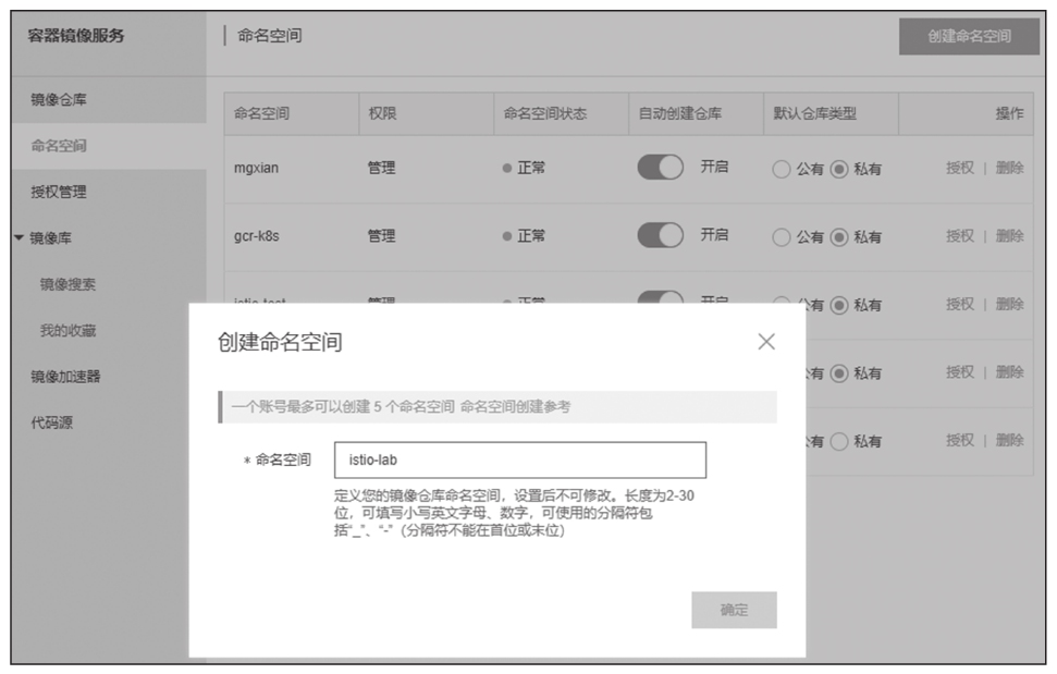命名空间不能重复,请注意修改命名空间名称,如图2-2所示,可创建名为istio-lab的命名空间。