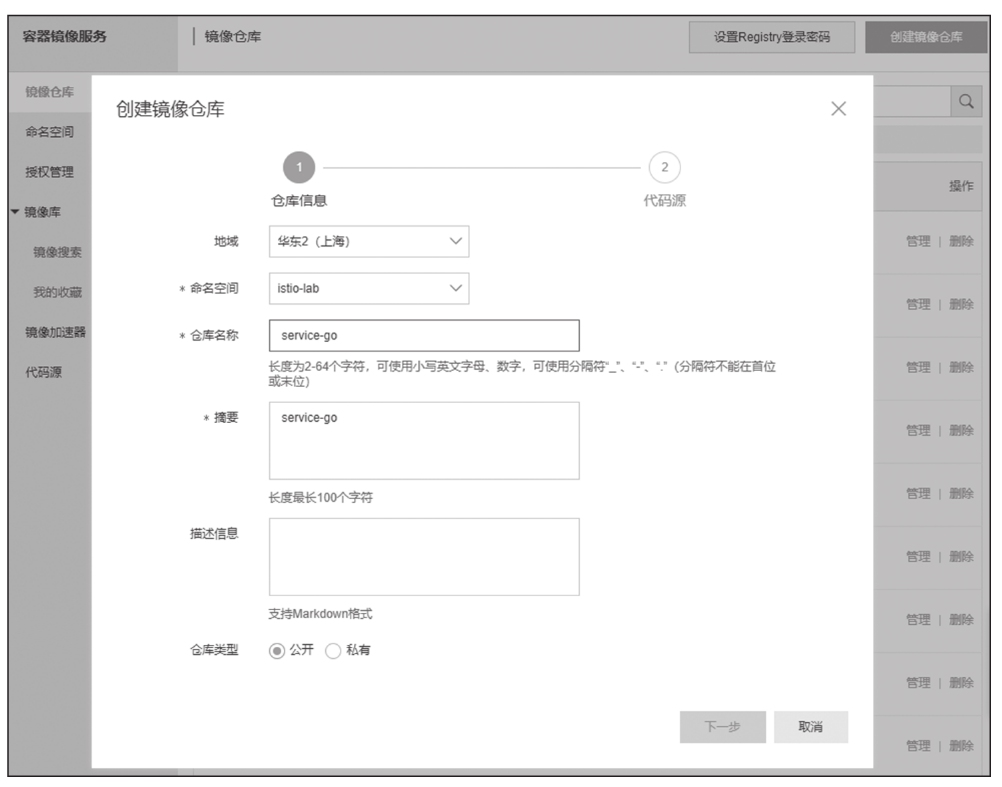 选择命名空间为上个步骤中创建的命名空间,填写要创建的镜像仓库名和简介,如service-go。注意选择仓库类型为公开,如图2-3所示。