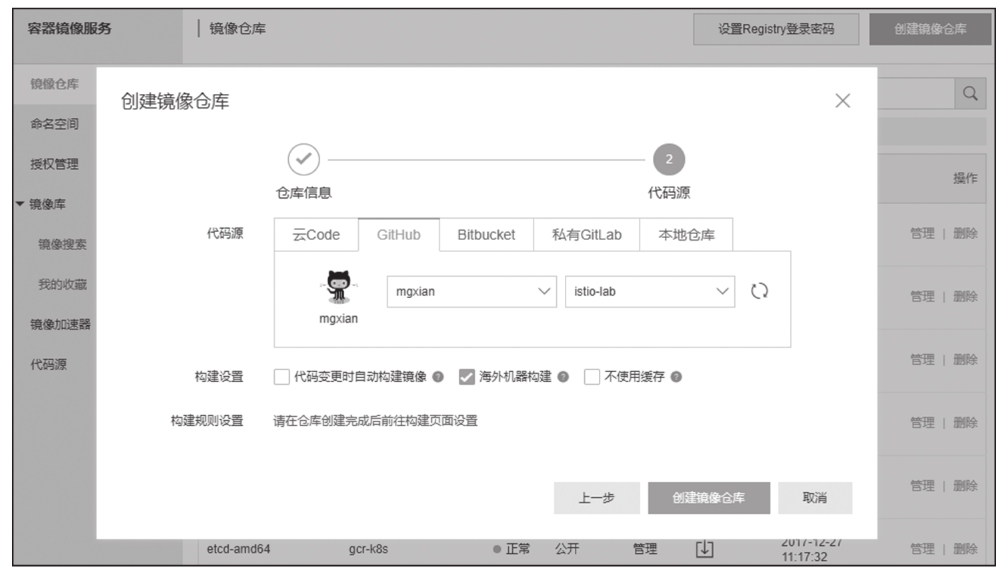 选择已经绑定的GitHub账号和要构建的源码仓库,由于构建时需要访问国外资源,因此勾选使用海外机器构建,并取消“选择代码变更时自动构建镜像”(如果首次使用需要先绑定GitHub账号),如图2-4所示。