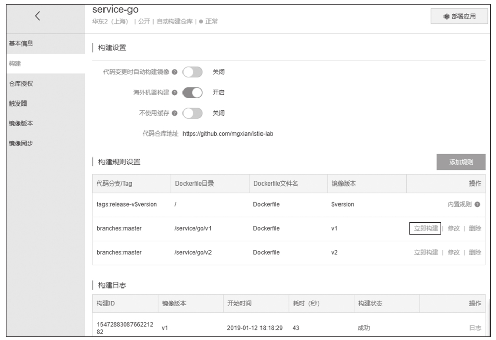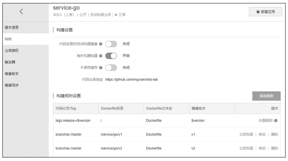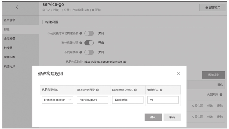 由于本书的实验重点在于如何使用Istio,如何使用本地Docker私有镜像仓库部署服务并不是我们关注的重点,所以本书实验所使用的镜像均采用阿里云镜像服务免费提供的镜像构建功能。当然,你也可以使用Docker Hub提供的镜像构建功能。下面以阿里云镜像服务为例实现镜像构建,具体步骤如下。