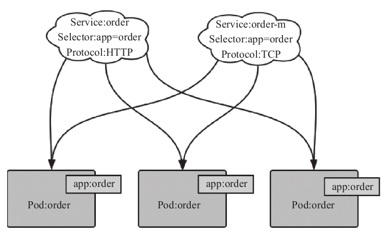 如果一个Pod属于多个Service,多个Service将不能使用同一个端口,并设置多个不同的协议,例如:两个Service选择了相同的后端Pod实例,但是分别使用了HTTP和TCP协议,如图5-2所示。