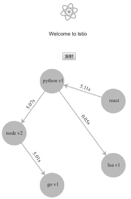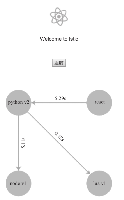 浏览器访问地址为http://11.11.11.111:31380/ ,多次点击“发射”按钮,查看服务调用情况,可以看到,有部分请求出现5秒左右的调用时延但调用成功,如图9-3所示。