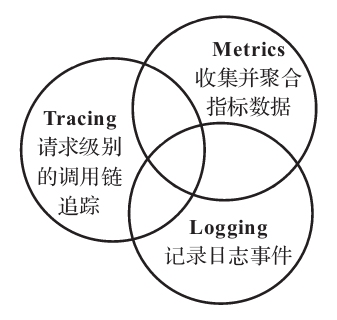 为了获取服务运行时的行为,可观测性很有必要。为了让服务更易观测,我们需要收集服务的日志(logging),统计服务的运行指标数据(metrics),记录服务的调用链追踪(tracing)。这三者都有互有重叠的功能部分,关系如图11-1所示。