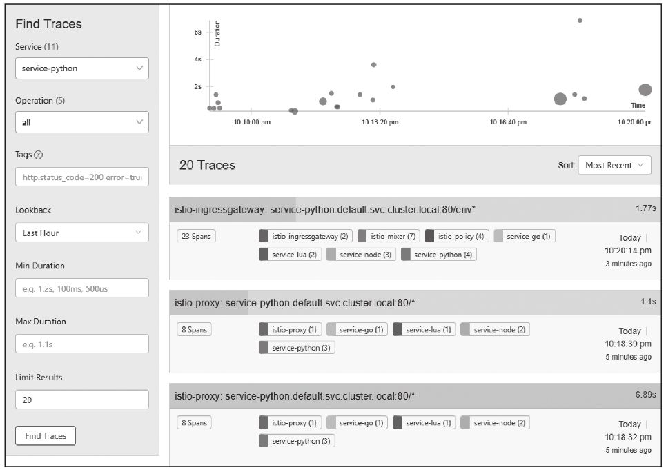 $ kubectl get deploy istio-tracing -n istio-system NAME DESIRED CURRENT UP-TO-DATE AVAILABLE AGE istio-tracing 1 1 1 1 21d $ kubectl get svc tracing -n istio-system NAME TYPE CLUSTER-IP EXTERNAL-IP PORT(S) AGE tracing ClusterIP 10.103.169.41 <none> 80/TCP 21d $ kubectl get svc zipkin -n istio-system NAME TYPE CLUSTER-IP EXTERNAL-IP PORT(S) AGE zipkin ClusterIP 10.109.10.212 <none> 9411/TCP 21d