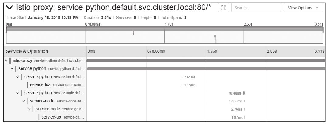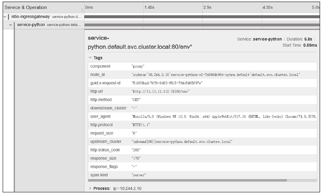 7)在Jaeger UI上查看指标数据。访问地址http://11.11.11.111:32144/ ,查看service-python服务调用链,如图11-9所示。