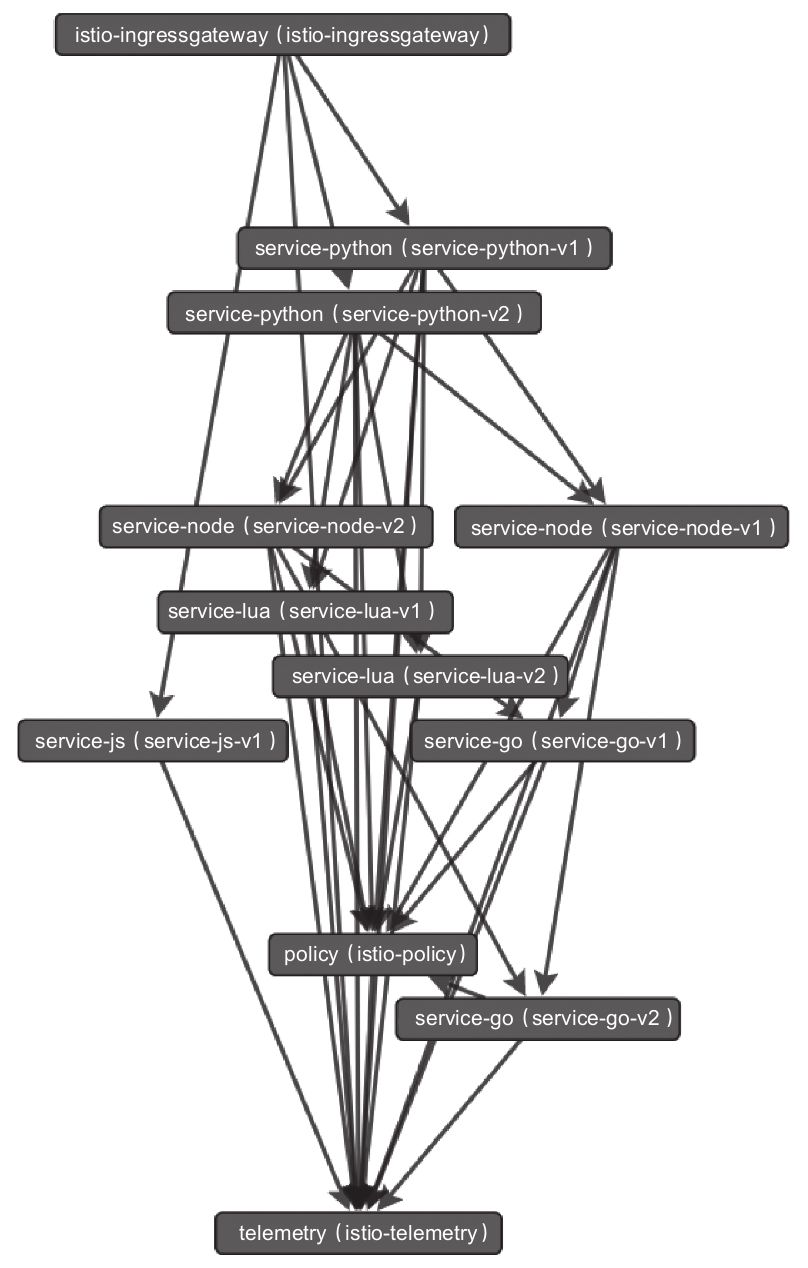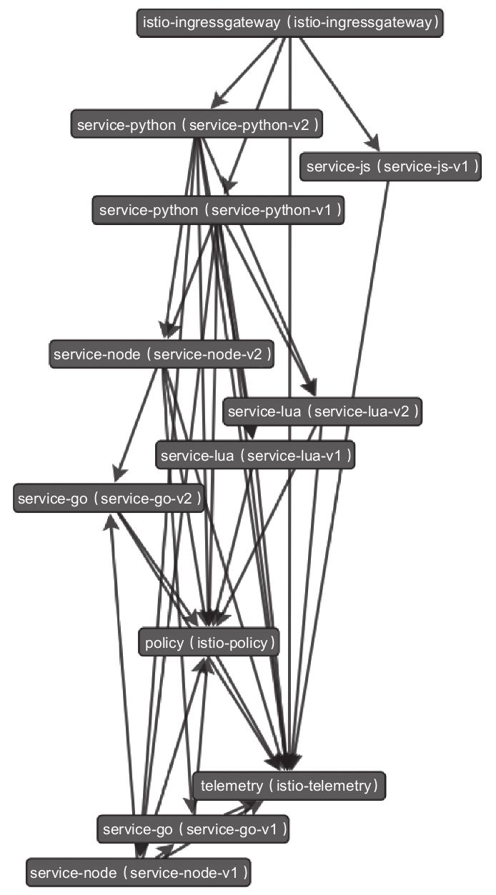 服务调用树可以帮助我们更好地了解服务间的调用关系,并优化服务间的调用关系,减少服务间不需要的依赖关系,从而使应用更稳定。Istio默认情况下使用ServiceGraph根据Prometheus中存储的指标数据来绘制网格内服务调用树。